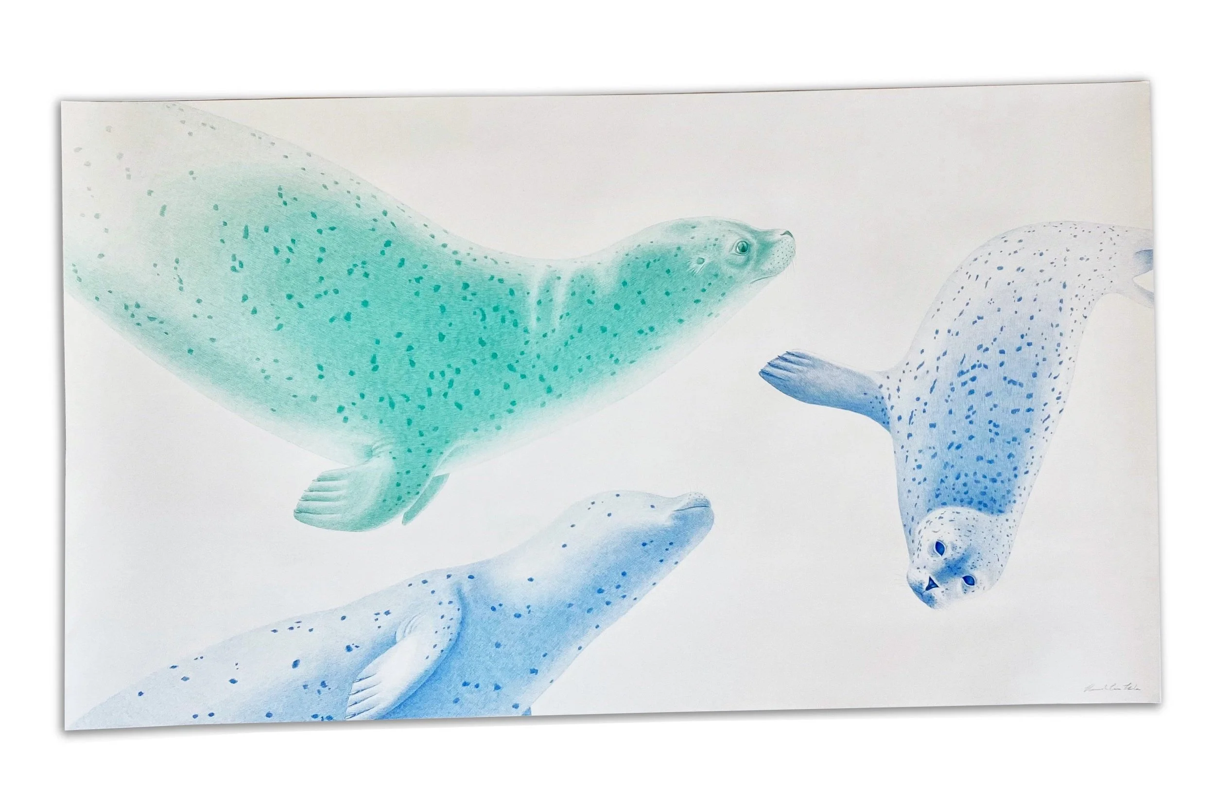 Together we researched species native to the area and decided to create a dynamic composition featuring three seals playing in the harbor, inspired by their three young children.