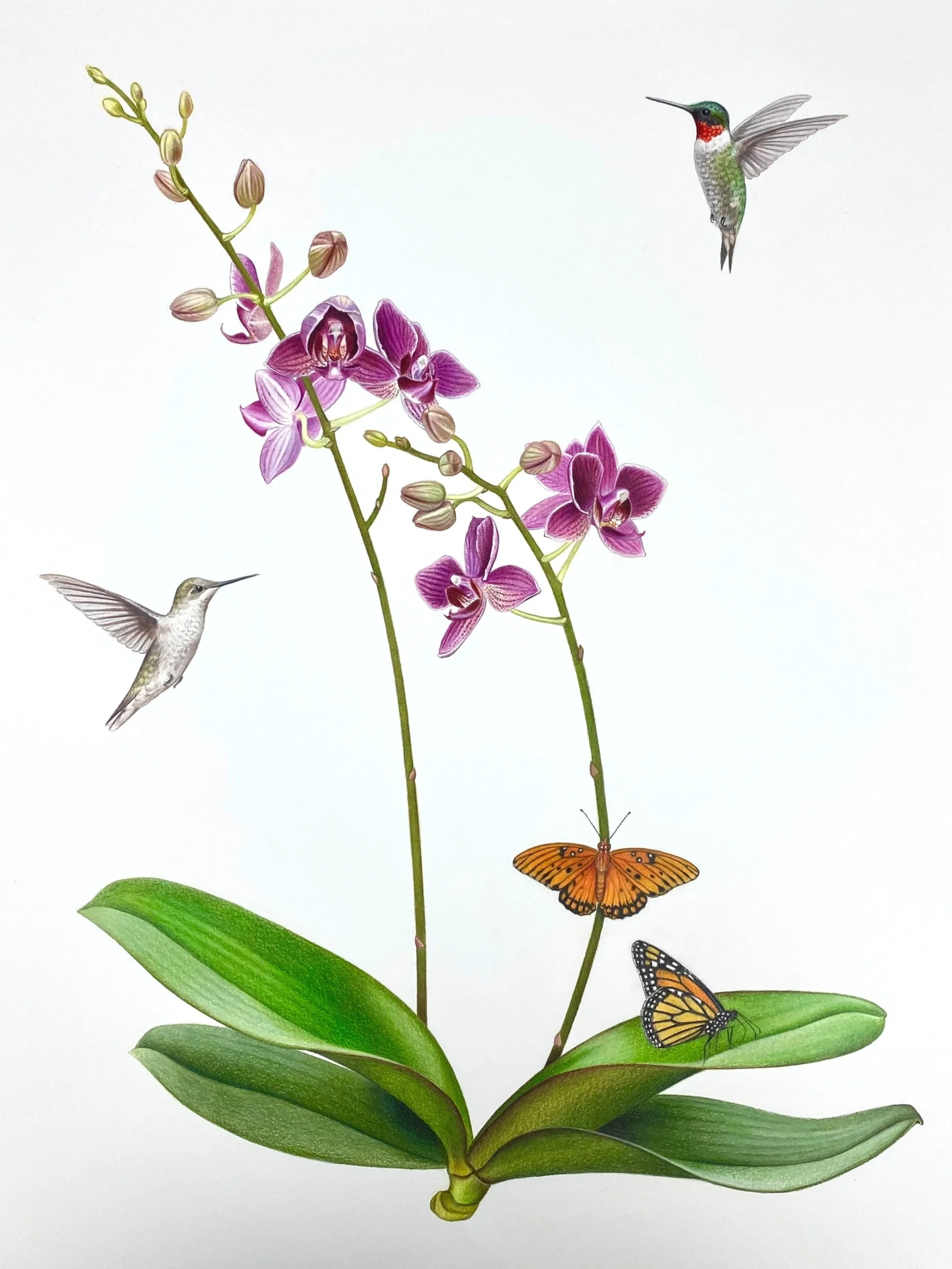 This pair of flora and fauna illustrations were commissioned for a Ponte Vedra home. Client collaboration was required to pick just the right subject matter and species, which was inspired by the more tropical climate and a pink and green color palette.